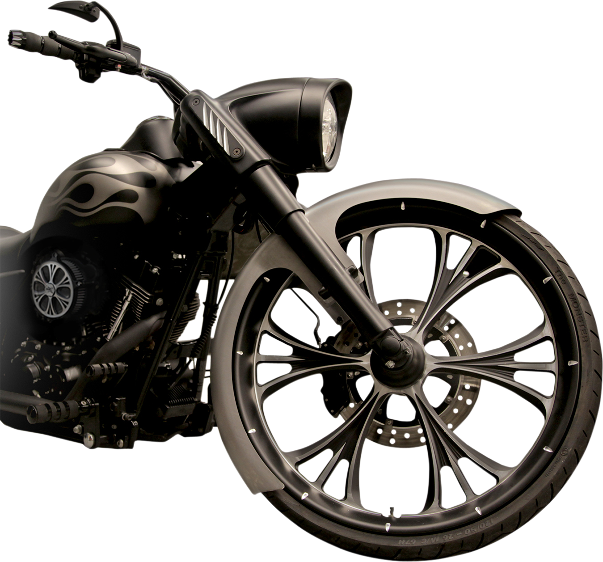 Stamped from 16-gauge U.S. steel. Raw finish. Come complete with fender adapter and mounting hardware. 6" wide, fit most 130/60-26 tires. Made in the U.S.A..